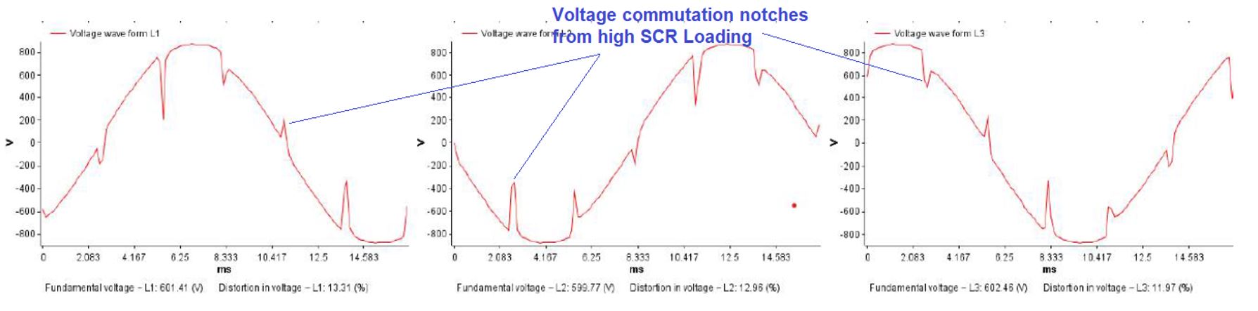The SCR equipment will distort supply voltage, causing commutation notches in the voltage sine wave when the DC Drive loading is high.